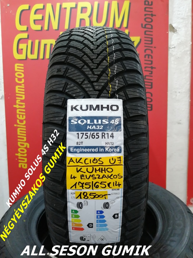 Kumho gumiabroncs gyár 175/65R14 méretű abroncsát T, azaz maximálisan 190 km/h sebességhez tervezte, ezért 82 vagyis 475kg az üzemszerű terhelhetősége. Ez a négyévszakos gumi a Kumho solus-4s-ha32 elnevezésű mintázatának segítségével tapad az útra, személy abroncs. Az EU-cimkézés A-tól G-ig terjedő skáláján, ahol az A legjobb értékelés, nedves tapadásra B, üzemanyag fogyasztásra D értékelést kapott , míg az abroncs zajszintje 71 dB mely a 0 kategóriába sorolja a gumiabroncsot ebből a szempontból .