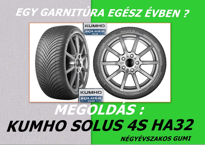 A Turizmus és SUV kategóriára tervezett, sokoldalú Kumho Solus 4S HA32 gumiabroncs rendelkezik a 3PMSF jelöléssel, ami a hóval borított talajon való tökéletes biztonságot igazolja. Magas teljesítményt nyújt bármilyen időjárási körülmények között, garantálja a tökéletes tapadást, kiváló fékhatást nedves talajon és nagy ellenállóképességet az aquaplaninggal szemben.