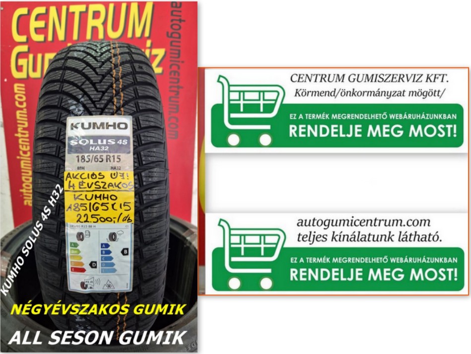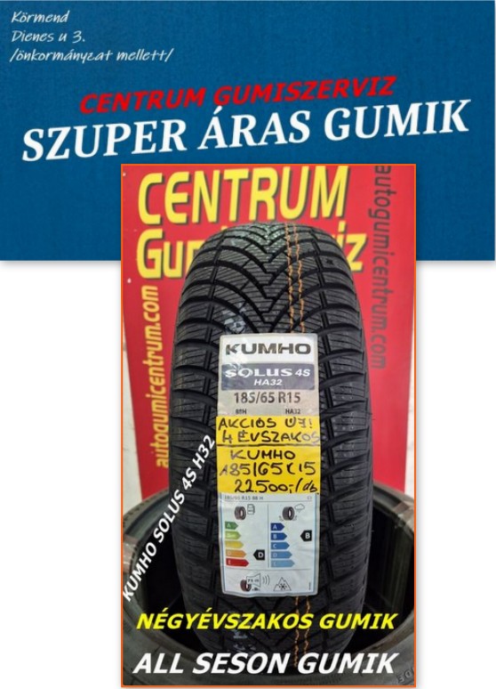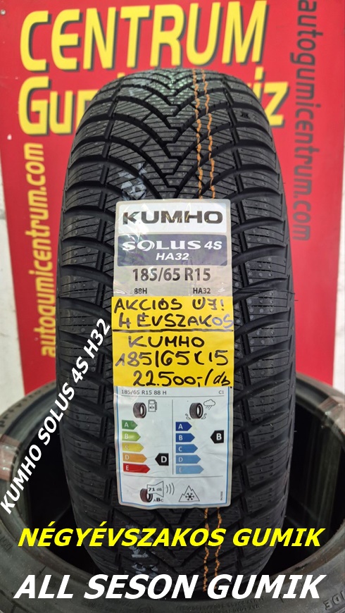 Kumho gumiabroncs gyár 185/65R15 méretű abroncsát H , azaz maximálisan 210 km/h sebességhez tervezte, ezért 88 vagyis 560kg az üzemszerű terhelhetősége. Ez a négyévszakos gumi a Kumho solus-4s-ha32 elnevezésű mintázatának segítségével tapad az útra, személy abroncs. Az EU-cimkézés A-tól G-ig terjedő skáláján, ahol az A legjobb értékelés, nedves tapadásra B , üzemanyag fogyasztásra D értékelést kapott , míg az abroncs zajszintje 71 dB mely a 0 kategóriába sorolja a gumiabroncsot ebből a szempontból .