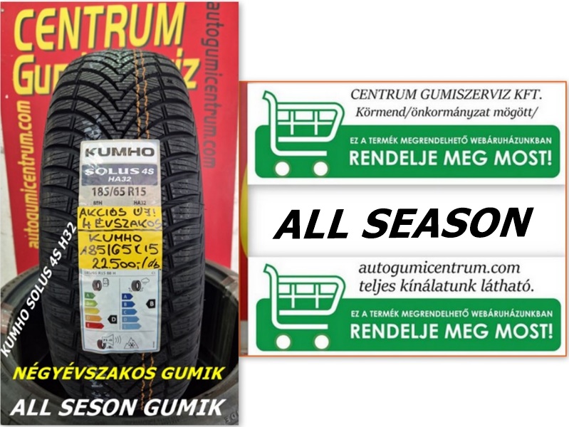 Kumho gumiabroncs gyár 185/65R15 méretű abroncsát H , azaz maximálisan 210 km/h sebességhez tervezte, ezért 88 vagyis 560kg az üzemszerű terhelhetősége. Ez a négyévszakos gumi a Kumho solus-4s-ha32 elnevezésű mintázatának segítségével tapad az útra, személy abroncs. Az EU-cimkézés A-tól G-ig terjedő skáláján, ahol az A legjobb értékelés, nedves tapadásra B , üzemanyag fogyasztásra D értékelést kapott , míg az abroncs zajszintje 71 dB mely a 0 kategóriába sorolja a gumiabroncsot ebből a szempontból .