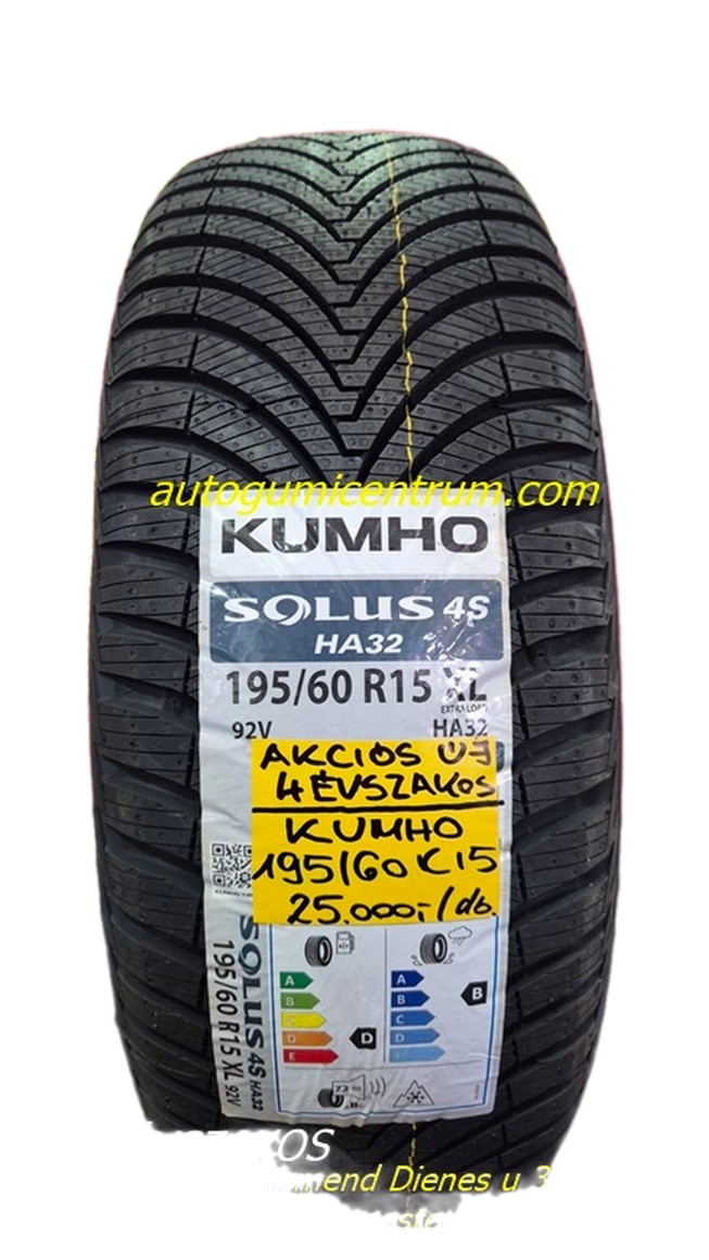 Kumho gumiabroncs gyár 195/60R15 méretű abroncsát V , azaz maximálisan 240 km/h sebességhez tervezte, ezért 92 vagyis 630kg az üzemszerű terhelhetősége. Ez a négyévszakos gumi a Kumho solus-4s-ha32 elnevezésű mintázatának segítségével tapad az útra, , erősített oldalfalú személy abroncs. Az EU-cimkézés A-tól G-ig terjedő skáláján, ahol az A legjobb értékelés, nedves tapadásra B , üzemanyag fogyasztásra D értékelést kapott , míg az abroncs zajszintje 72 dB mely a 2 kategóriába sorolja a gumiabroncsot ebből a szempontból .