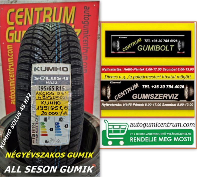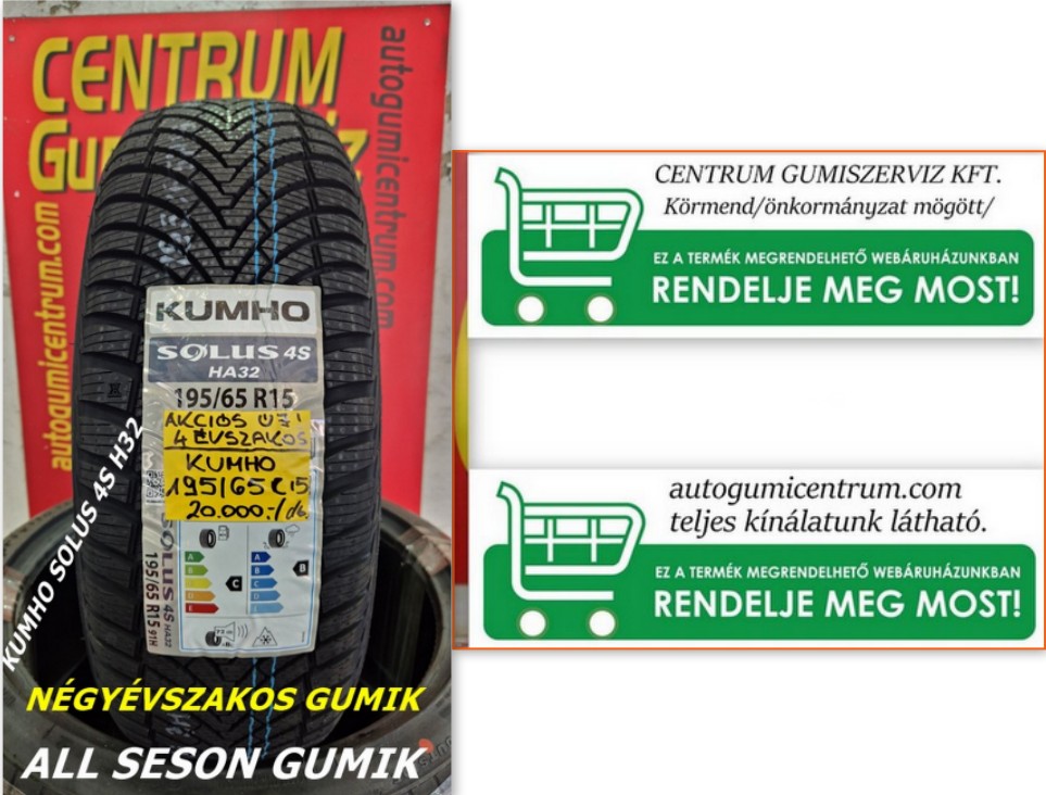 Kumho gumiabroncs gyár 195/65R15 méretű abroncsát H , azaz maximálisan 210 km/h sebességhez tervezte, ezért 91 vagyis 615Kg az üzemszerű terhelhetősége. Ez a négyévszakos gumi a Kumho solus-4s-ha32 elnevezésű mintázatának segítségével tapad az útra, személy abroncs. Az EU-cimkézés A-tól G-ig terjedő skáláján, ahol az A legjobb értékelés, nedves tapadásra B , üzemanyag fogyasztásra C értékelést kapott , míg az abroncs zajszintje 72 dB mely a 2 kategóriába sorolja a gumiabroncsot ebből a szempontból .