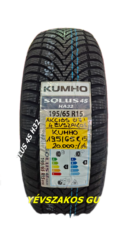 Kumho  gumiabroncs gyár  195/65R15  méretű abroncsát  H , azaz maximálisan  210 km/h  sebességhez tervezte, ezért  91  vagyis  615Kg  az üzemszerű terhelhetősége. Ez a  négyévszakos  gumi a  Kumho  solus-4s-ha32  elnevezésű mintázatának segítségével tapad az útra,  személy  abroncs. Az EU-cimkézés A-tól G-ig terjedő skáláján, ahol az A legjobb értékelés, nedves tapadásra  B , üzemanyag fogyasztásra  C  értékelést kapott , míg az abroncs zajszintje  72 dB  mely a  2  kategóriába sorolja a gumiabroncsot ebből a szempontból .