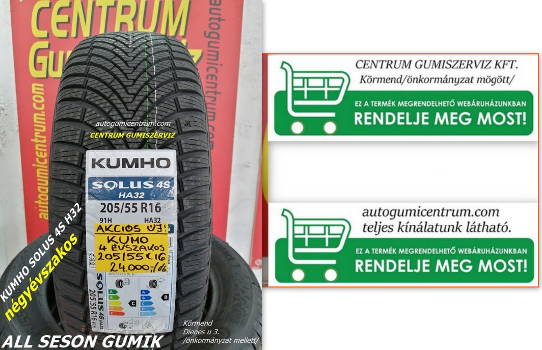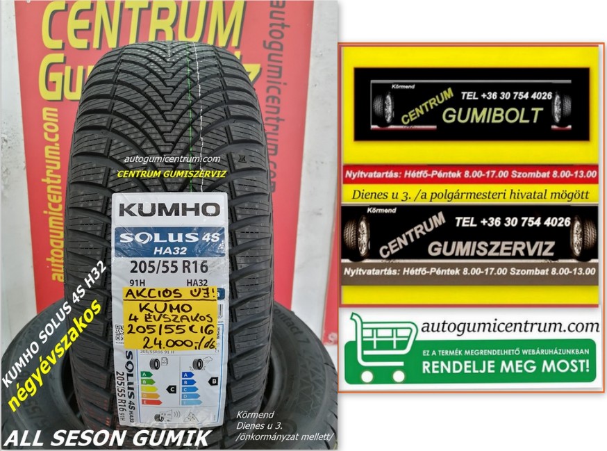 KUMHO gumiabroncs gyár 205/55R16 méretű abroncsát H , azaz maximálisan 240 km/h sebességhez tervezte, ezért 91 vagyis 670kg az üzemszerű terhelhetősége. Ez anégy évszakos gumi a HA32 SOLUS 4S XL KUMHO elnevezésű mintázatának segítségével tapad az útra, , erősített oldalfalú személy abroncs. Az EU-cimkézés A-tól G-ig terjedő skáláján, ahol az A a legjobb értékelés, nedves tapadásra B, üzemanyag fogyasztásra C értékelést kapott .